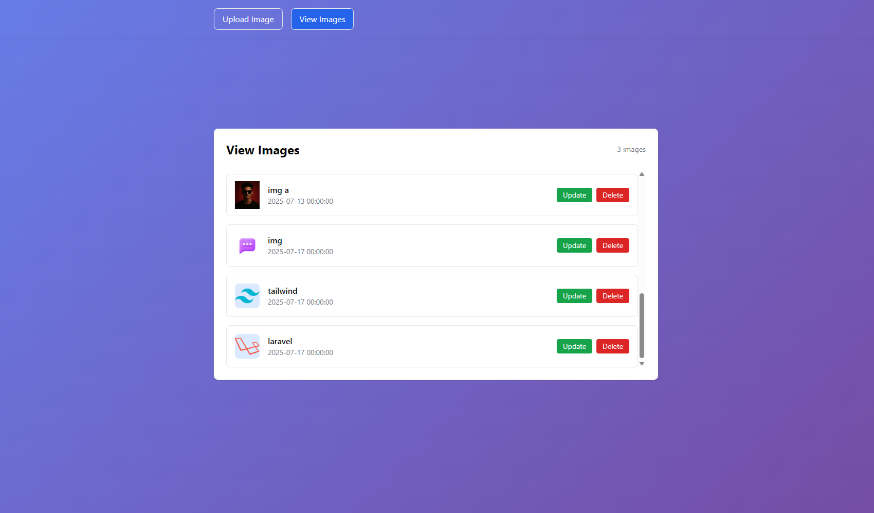 Using LARAVEL and PHP Image Gallery Web App, Upload image & title store to mysql database, Image page with real-time Update & Delete buttons. Smart alert component system that confirms upload, update, or deletion success.